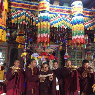 Led by Khenpo Ugyen Wangchuk, the annual Wrathful Guru Rinpoche, nine day Drupchen is taking place at Chugom Monastery in Tashi Yangtse Eastern Bhutan. A Drupchen or “vast accomplishment” practice is an intensive group practice that brings together all of the skillful methods of Vajrayana Buddhism to create a transcendent environment that awakens in participants the pure perception of this world as a sacred realm. Before the start of this Drupchen each year, new clothing is offered to monks and other practitioners. This year over 300 monks, nuns and lay practitioners have gathered with an aspiration for World Peace.